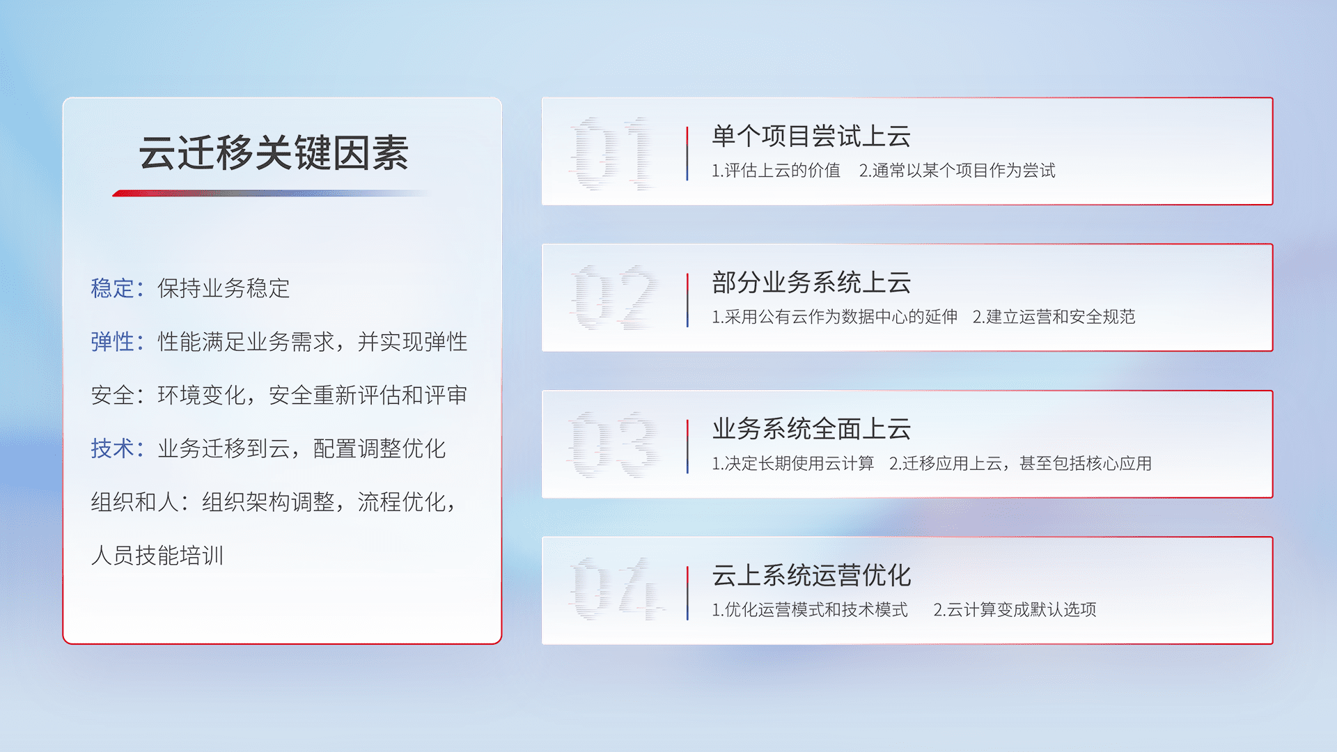 结合实际业务,,,从规划设计、、、云平台选型、、云原生改造、、、、数据迁移、、、、集成交付,,迁移全过程为客户识别最佳上云路径,,做好风险识别管理,,设计网络架构、、身份权限、、、安全审计合规、、、、操作审计、、、日志审计、、、监控告警策略、、、、多站点容灾设计等,,,,对云上基础设施进行整体规划,,提升IT治理水平,,,以满足弹性、、、高可用、、、高性能的需求。。