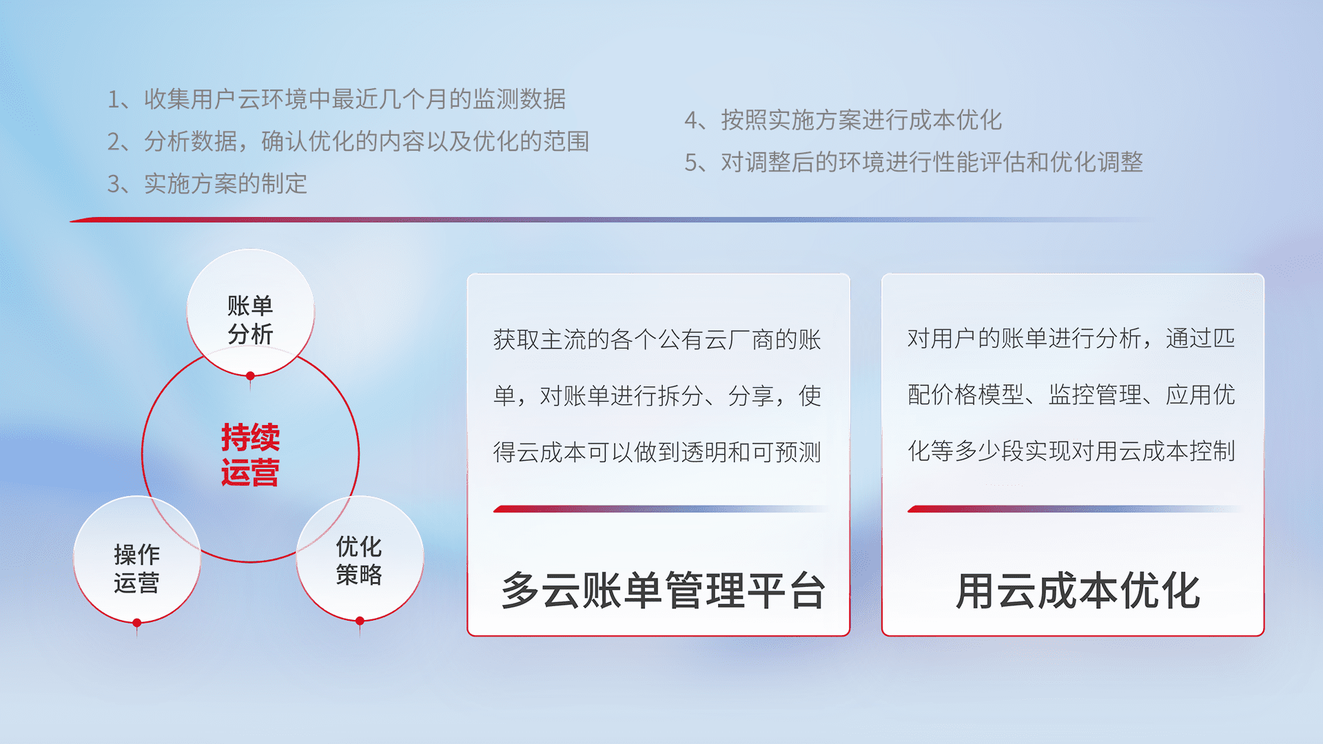 通过多云纳管,,以统一的资源数据模型把客户的云资源进行抽象和封装,,,进而实现对多云资源的统一操作,,,保障云资源管理的可靠性、、稳定性与可用性。。量身定制化运维内容,,,配置、、开发运维、、、补丁管理、、、备份、、监控、、认证和访问管理、、、审计和日常巡检等,,,,保障在用云过程中的可靠度,,稳定度以及高可用率。。。。