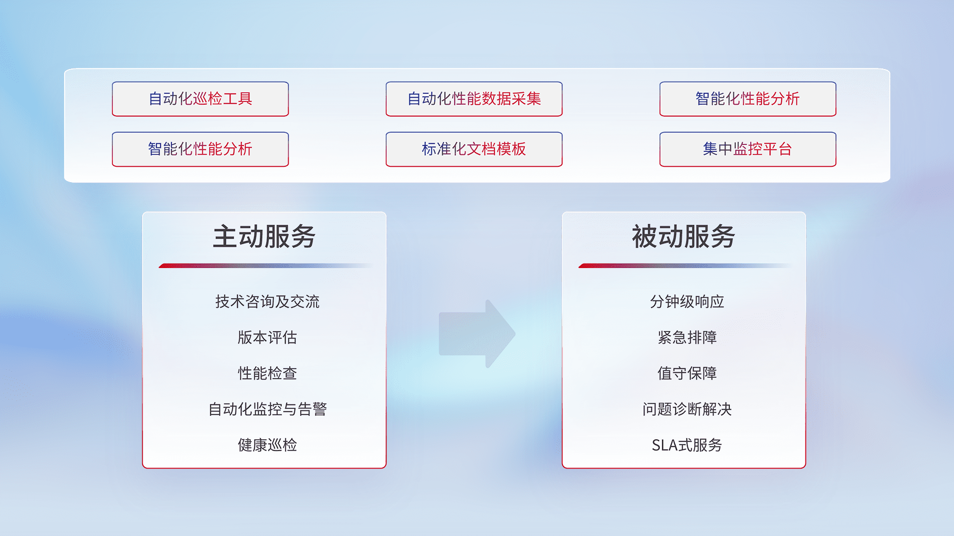 智能化工具和标准化文档,,,,保障服务质量,,,提供主动服务(包含技术咨询、、、、版本评估、、、、性能检查、、、自动化监控与告警、、、、健康巡检)和被动服务包含(分钟级响应、、、、紧急排障、、、、值守保障、、、、问题诊断解决、、、、SLA服务)。。